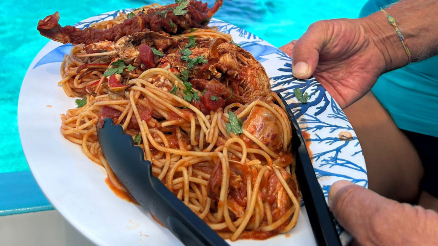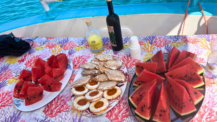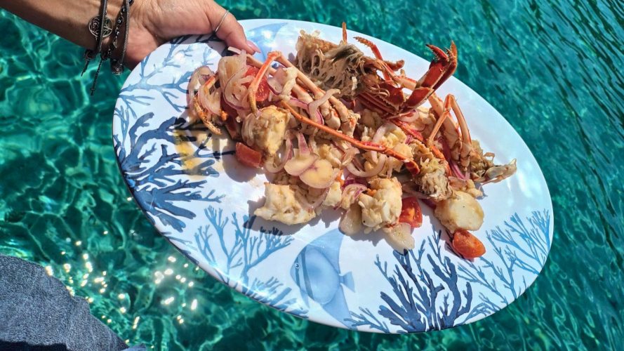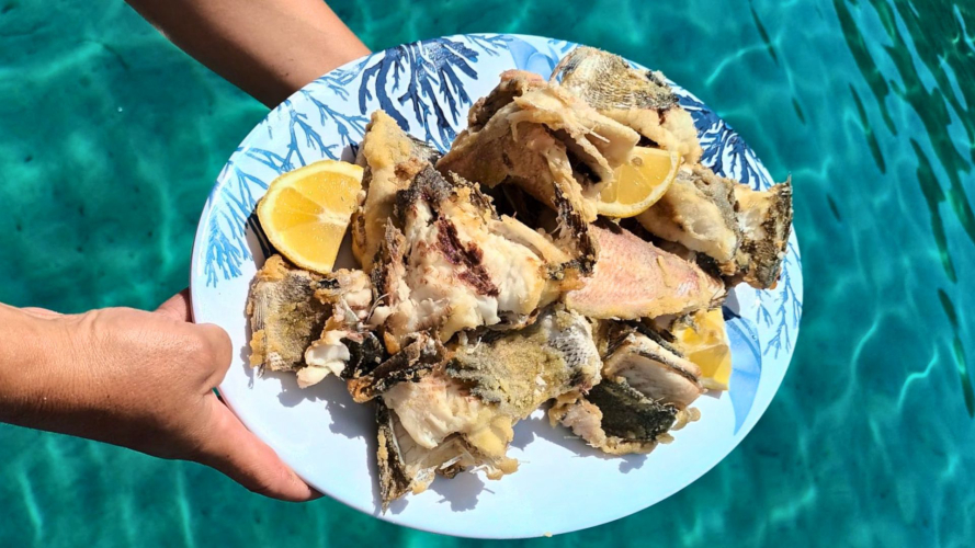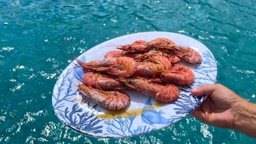 Genießen Sie ein köstliches Mittagessen an Bord mit frisch gefangenem Fisch und lokalem Wein